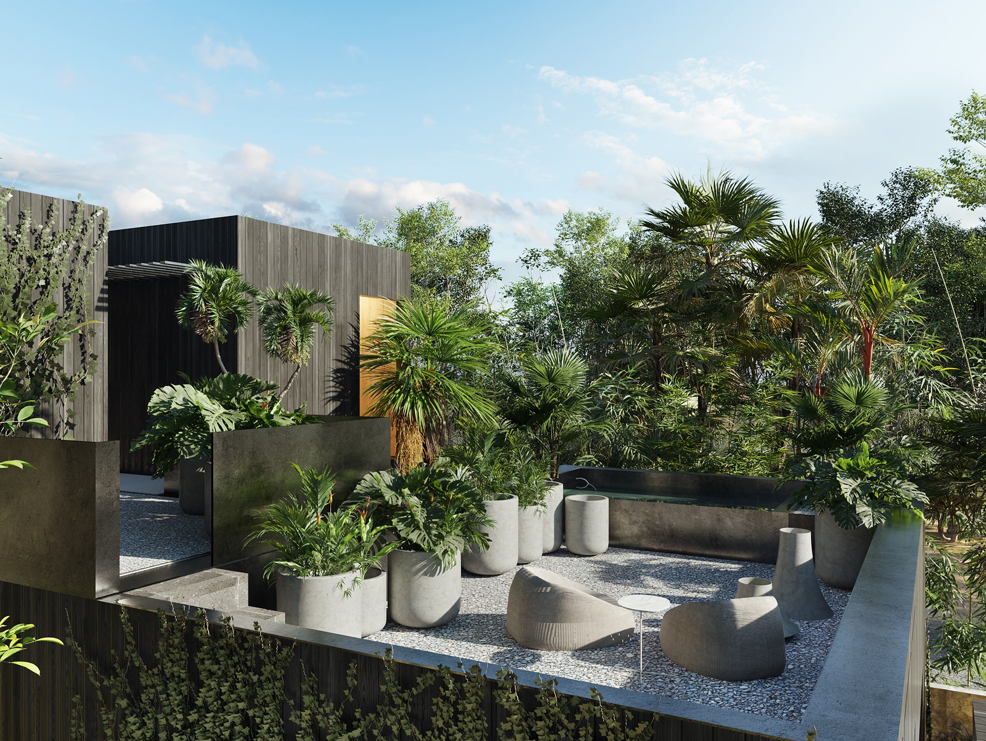 Las áreas comunes son un reflejo de este concepto de sostenibilidad y comunidad. Espacios como el spa, la cancha de tenis y la alberca de más de 25 metros están diseñados para integrarse de forma natural al paisaje, utilizando materiales locales y técnicas de construcción que respetan el medio ambiente. Los elementos arquitectónicos, como pérgolas y jardines interiores, están pensados para maximizar el uso de la luz natural y la ventilación, creando un ambiente fresco y cómodo para todos los residentes.