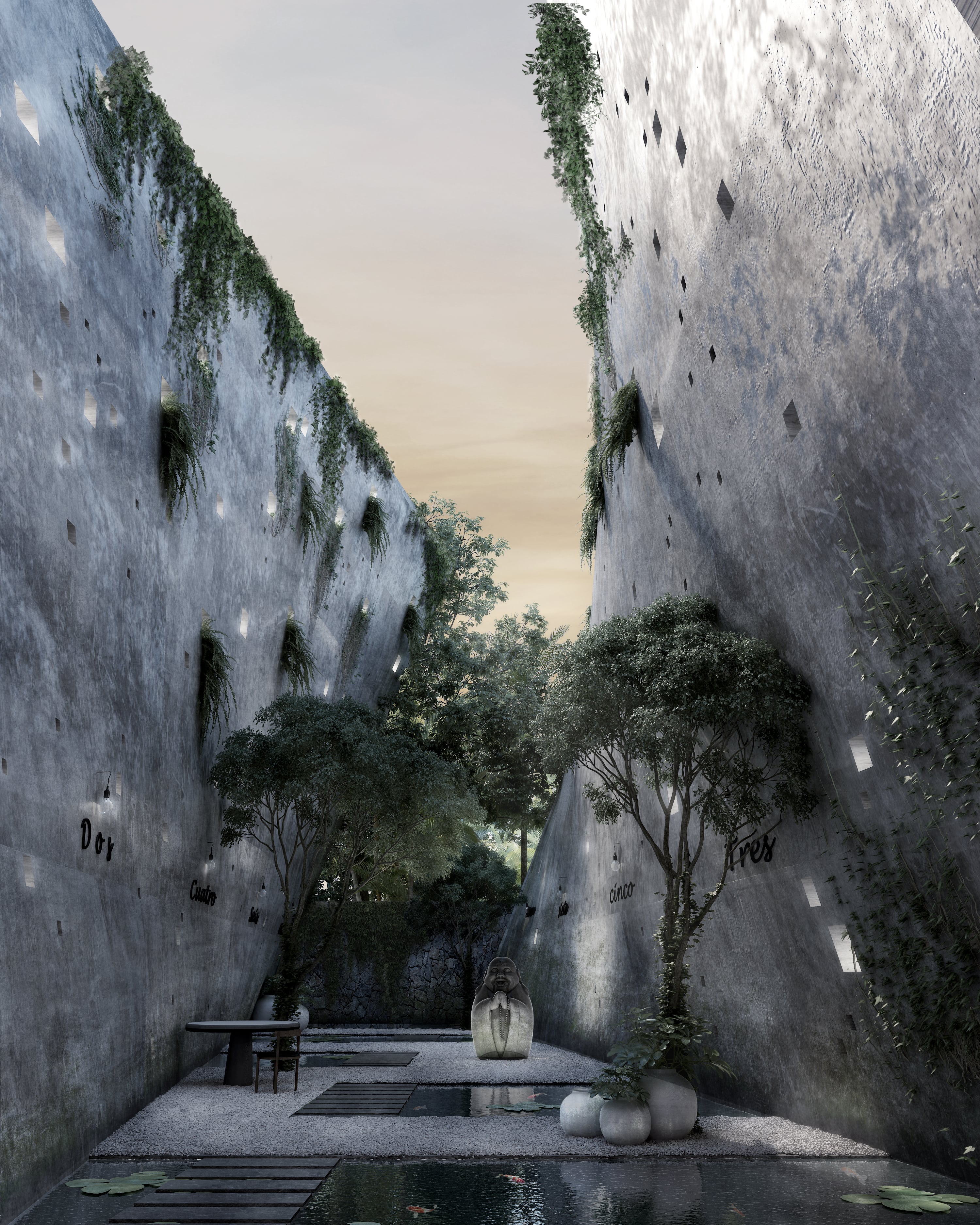 Único Hotel es un proyecto arquitectónico destacado, ubicado frente a la playa sobre la carretera Bocapaila en Tulum, un destino reconocido por su belleza natural y su vibrante escena cultural. El diseño del hotel parte de la premisa de crear un espacio que celebre la elegancia, el arte y la cultura local, al mismo tiempo que se integra de manera armónica con el paisaje costero. El concepto centraliza su distribución en torno a un patio, que se convierte en el núcleo del proyecto y en el punto de convergencia de dos elementos clave, diseñados a partir de superficies regladas que generan un contraste con la naturaleza orgánica del entorno. Este patio actúa como un espacio de tránsito, pero también como un refugio sereno que conecta a los huéspedes con la tranquilidad del lugar.
