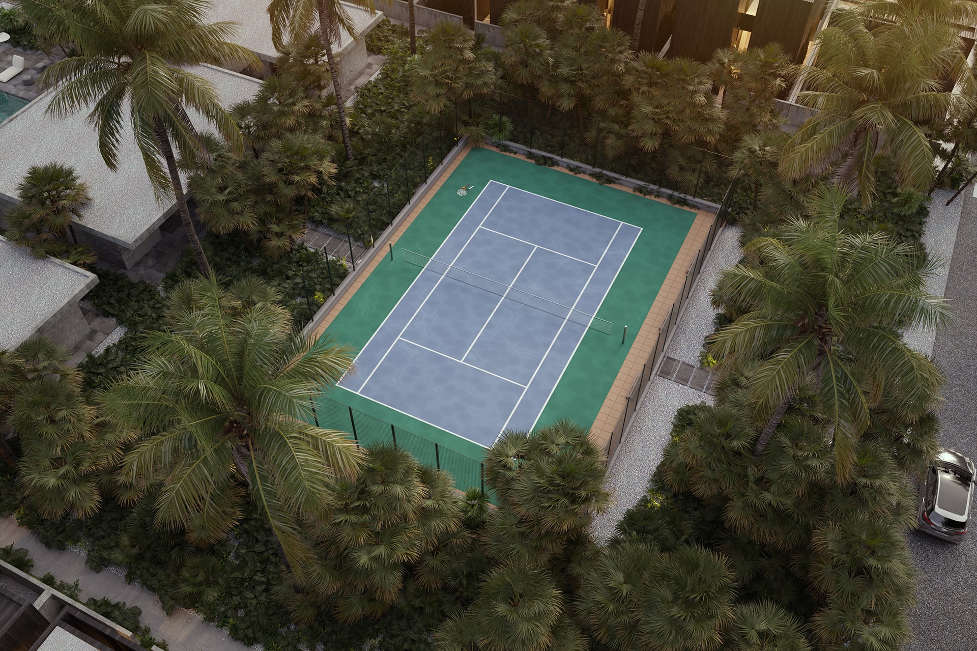 Las áreas comunes son un reflejo de este concepto de sostenibilidad y comunidad. Espacios como el spa, la cancha de tenis y la alberca de más de 25 metros están diseñados para integrarse de forma natural al paisaje, utilizando materiales locales y técnicas de construcción que respetan el medio ambiente. Los elementos arquitectónicos, como pérgolas y jardines interiores, están pensados para maximizar el uso de la luz natural y la ventilación, creando un ambiente fresco y cómodo para todos los residentes.