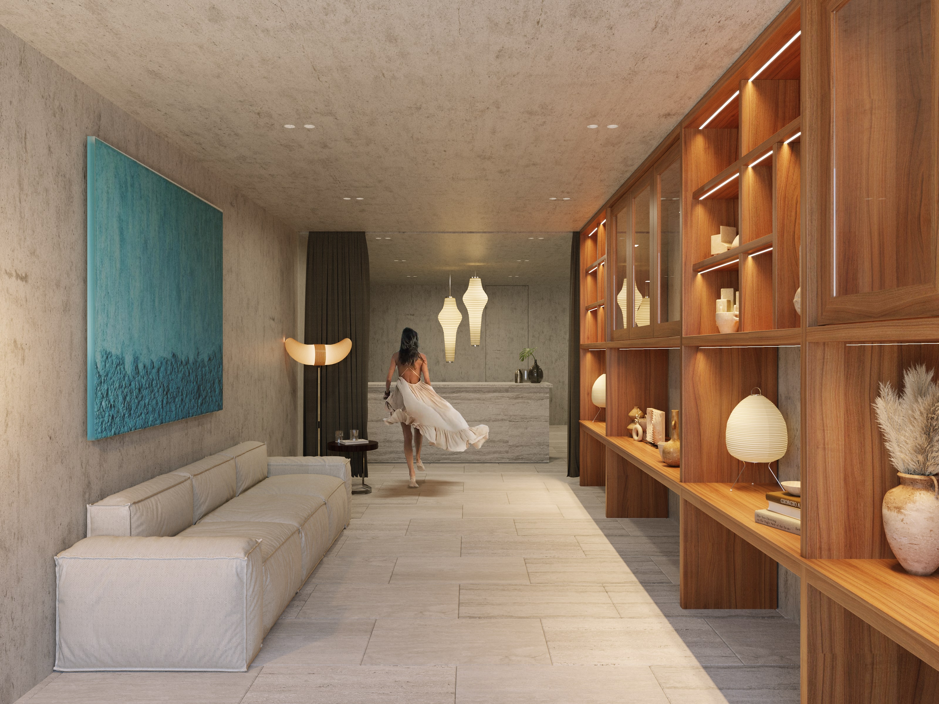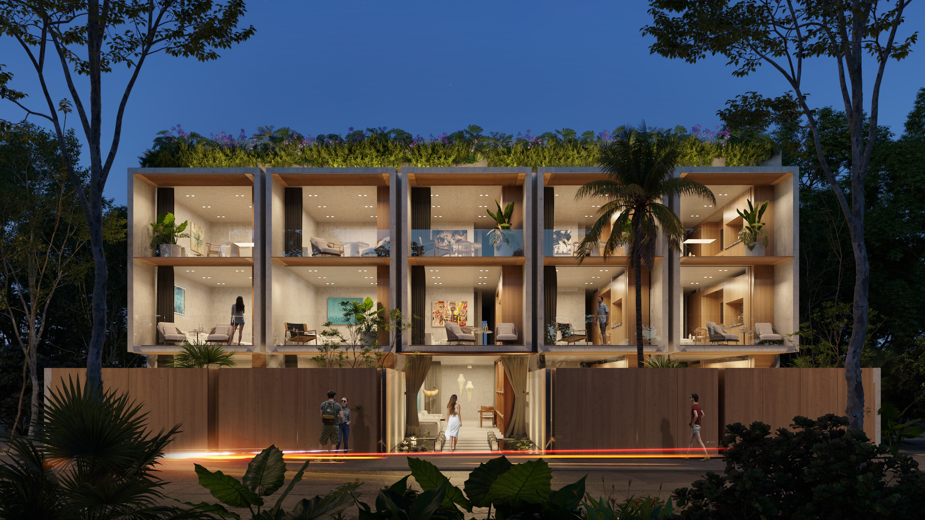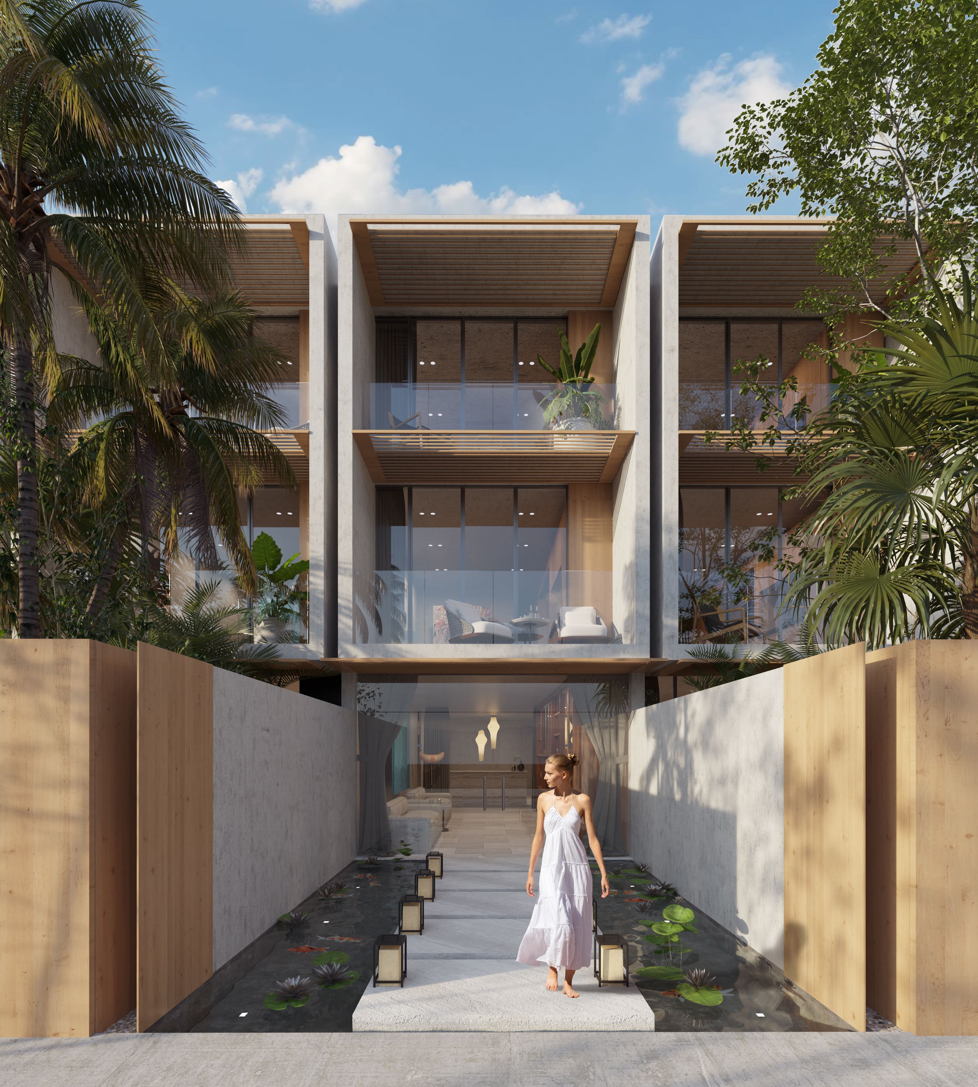 El diseño se organiza en torno a una fachada discreta que simula la presencia de solo cinco townhouses, creando un ambiente de elegancia y exclusividad ante la alta demanda en la zona. Esta estrategia arquitectónica minimiza el impacto visual y preserva la serenidad del entorno, generando un balance perfecto entre privacidad y accesibilidad.