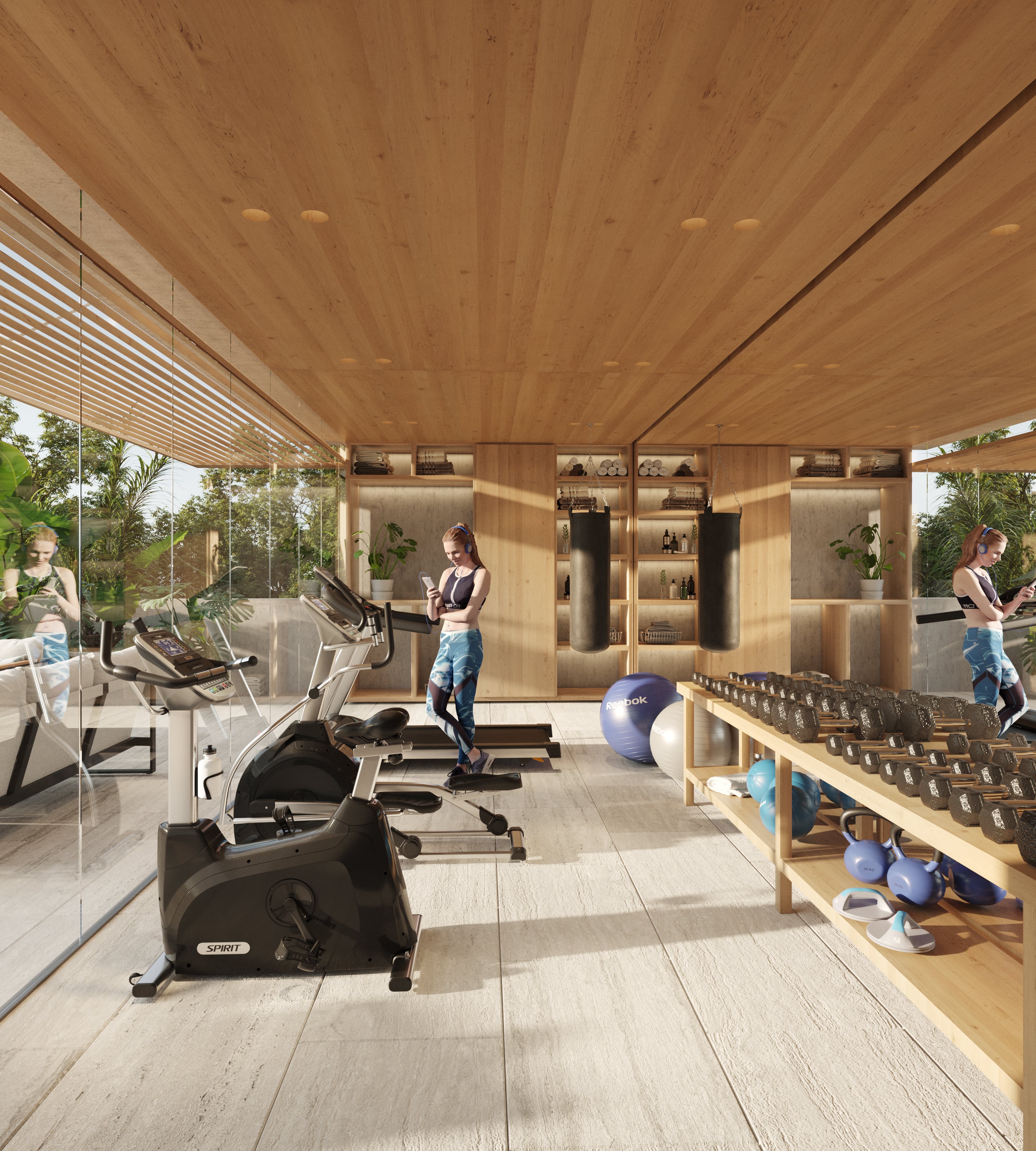El desarrollo también ofrece diversas amenidades que complementan la experiencia de vida en el proyecto, como un gimnasio, áreas comunes para eventos, y un espacio dedicado al bienestar, ideal para actividades de yoga o meditación.