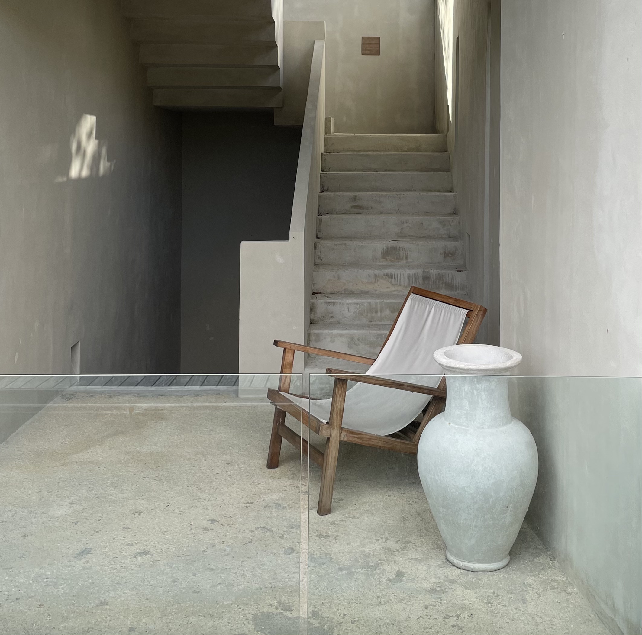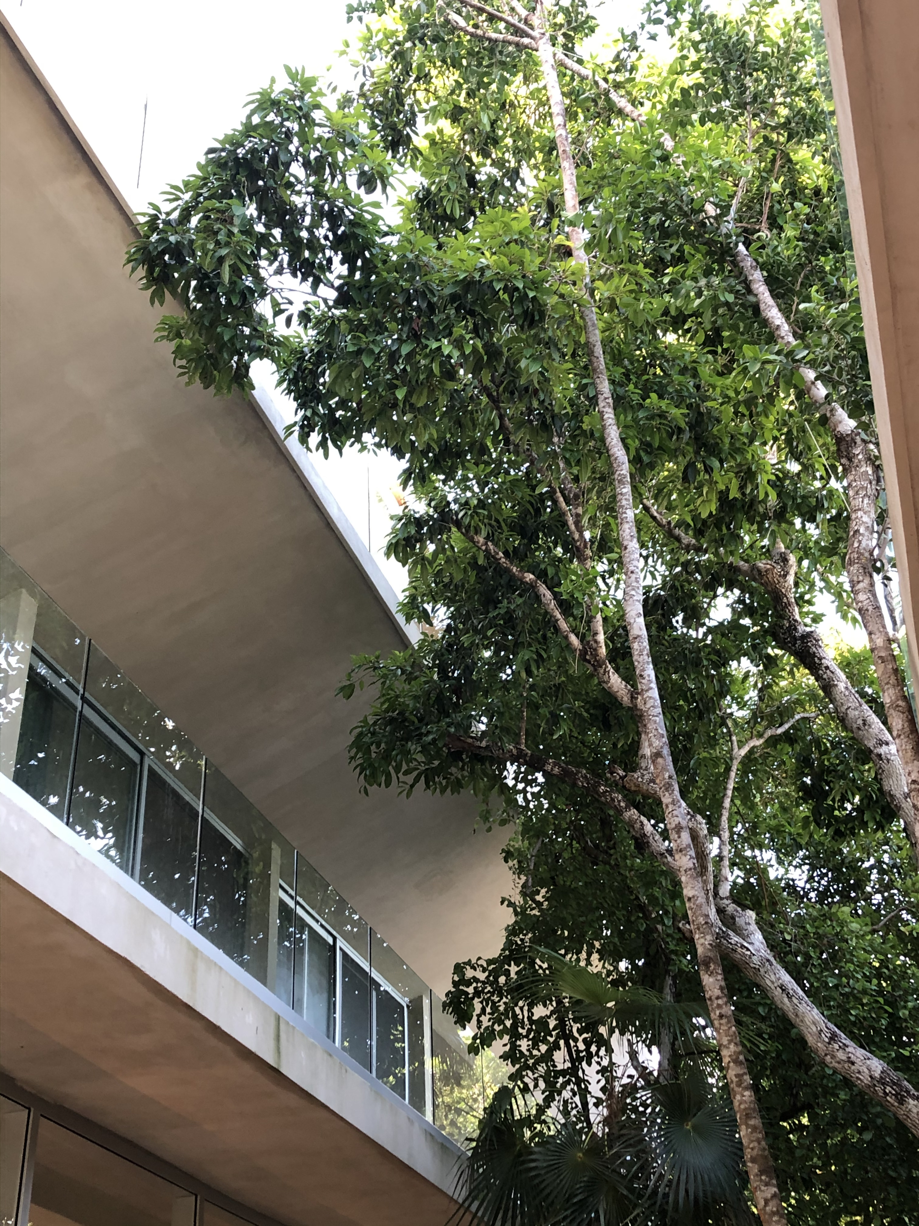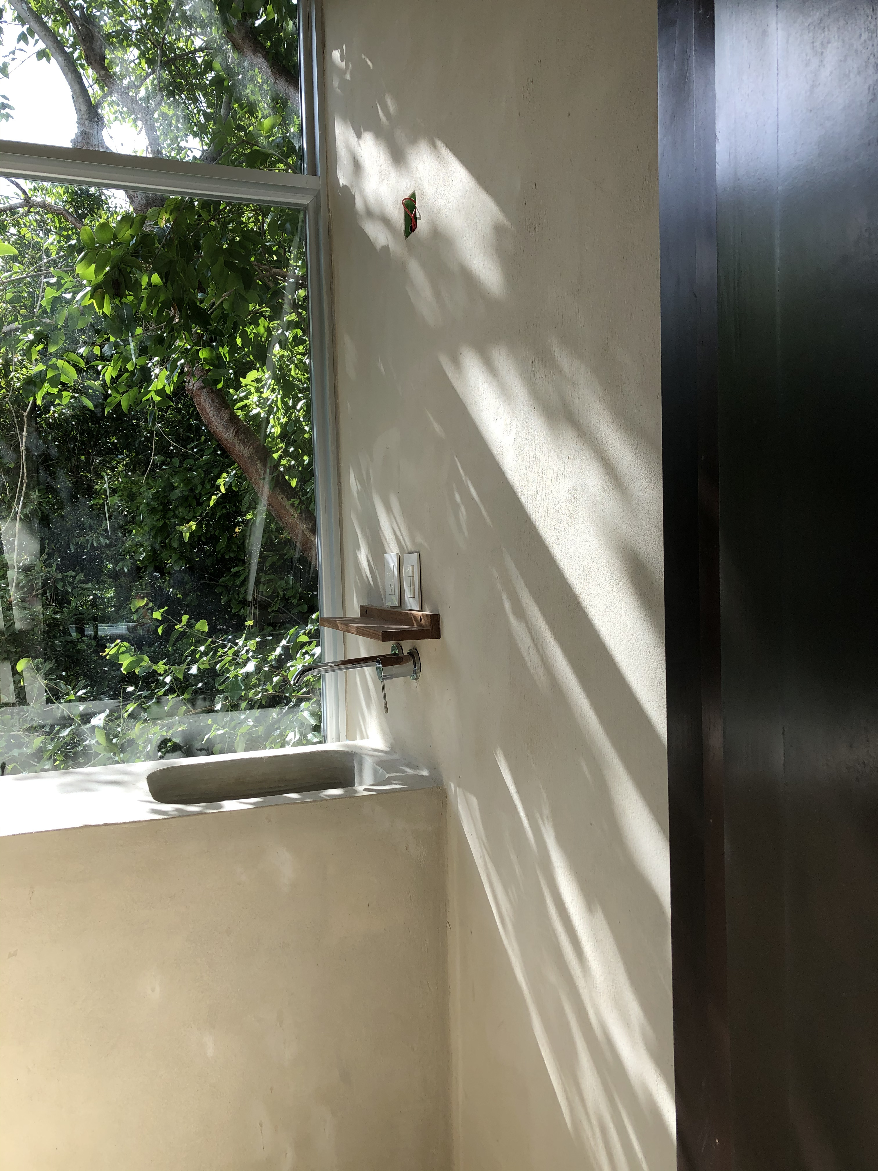 La sombra y el juego de hojas sobre los materiales, crean una intersección entre la naturaleza y el hombre. Anima la superficie del elemento y se convierte en una forma de decoración por derecho propio. El valor de la sombra en un edificio es significativo, ya que define el espacio y le da al ojo un lugar para descansar. La gran calidad de vida se produce cuando el énfasis arquitectónico se equilibra entre el exterior y el interior. La estructura del espacio exterior actúa como una envoltura para el espacio interior. Aún así, ambos deben considerarse de manera integral y ejecutarse como uno.